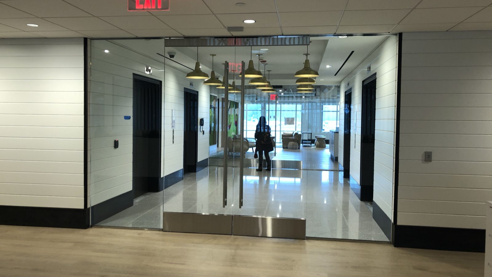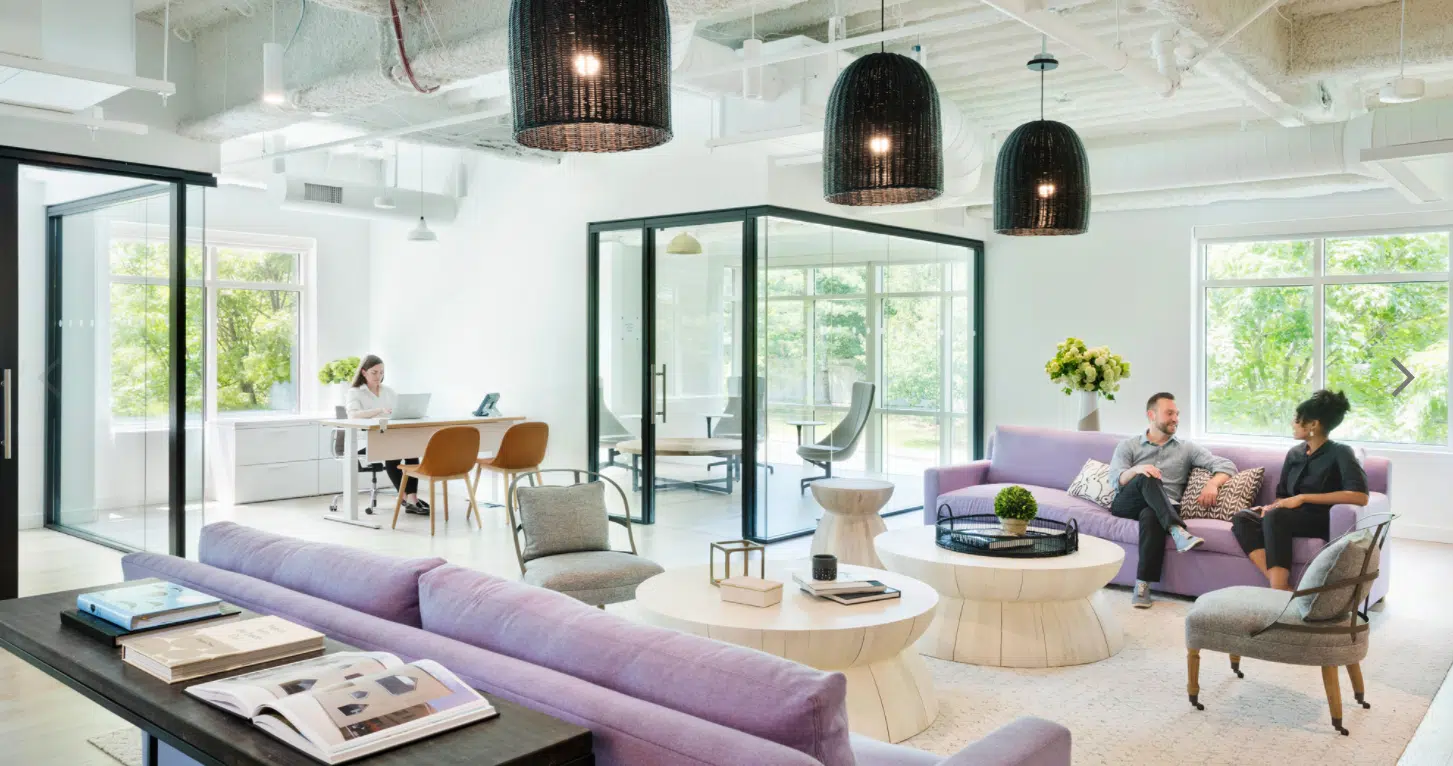 IAW selected and sourced products from a variety of manufacturers to support the “resimercial” (residential-commercial) design vision. Examples include glazing and entryway doors by Oldcastle; mirrors from Division 9, Restoration Hardware, and Wayfair; and whiteboards from Claridge. Sleek, Haworth Enclose Frameless Glass demountable walls allow natural light to flood the space.