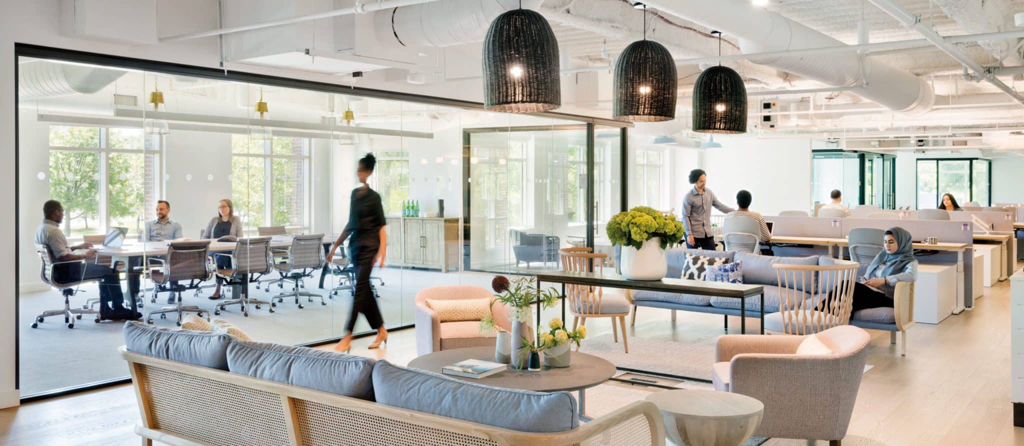 IAW selected and sourced products from a variety of manufacturers to support the “resimercial” (residential-commercial) design vision. Examples include glazing and entryway doors by Oldcastle; mirrors from Division 9, Restoration Hardware, and Wayfair; and whiteboards from Claridge. Sleek, Haworth Enclose Frameless Glass demountable walls allow natural light to flood the space.